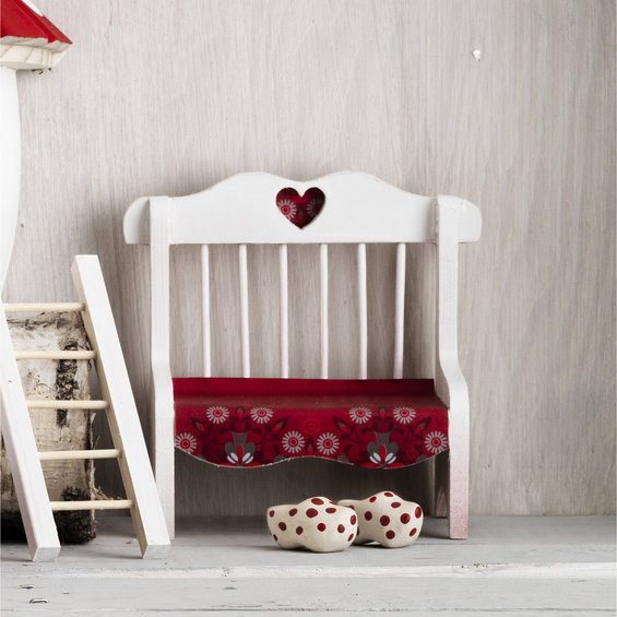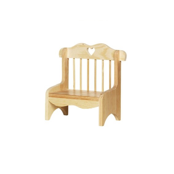 Pieni puinen sohva, jossa on sydän selkänojassa. 6 x 10,5 x 12 cm. Toimitetaan valmiiksi koottuina.