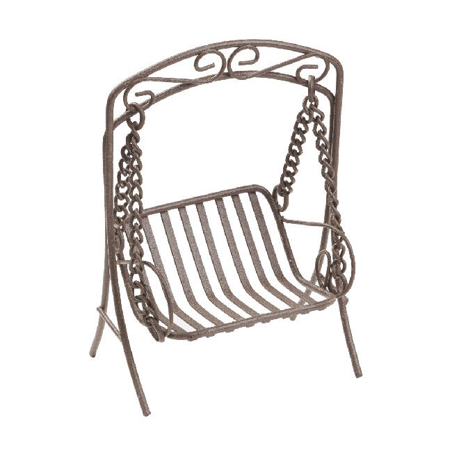 Puutarhakalusteet miniatyyri, ruskeaa metallia. Täydellinen nukkekotiin tai miniatyyri asetelmaan. Keinu, korkeus noin 11 cm.