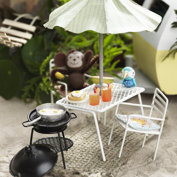 Puutarhakalusteet miniatyyri, valkoista metallia. Täydellinen nukkekotiin tai miniatyyri asetelmaan. Puutarha pöytä suora 62x92 mm.