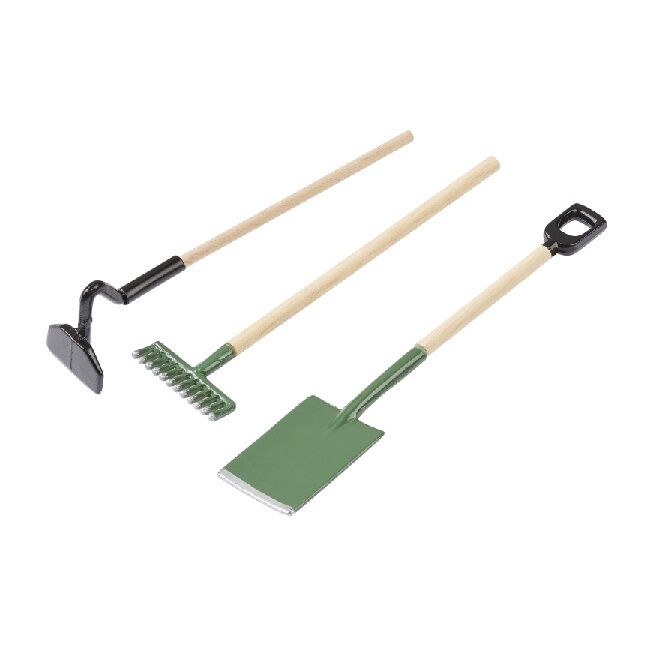 Puutarhatarvikkeet, pienet, metalliset. Täydellinen nukkekotiin tai miniatyyri asetelmaan. Puutarhatyökalut, 3 kpl. Korkeus noin 9 cm. Lapio, harava ja kuokka.