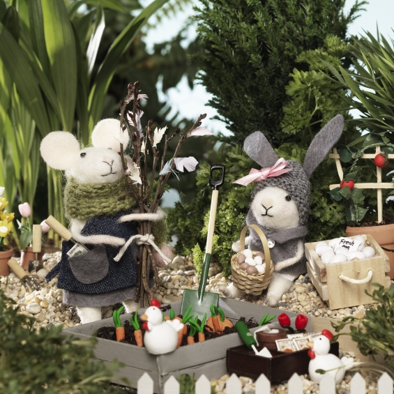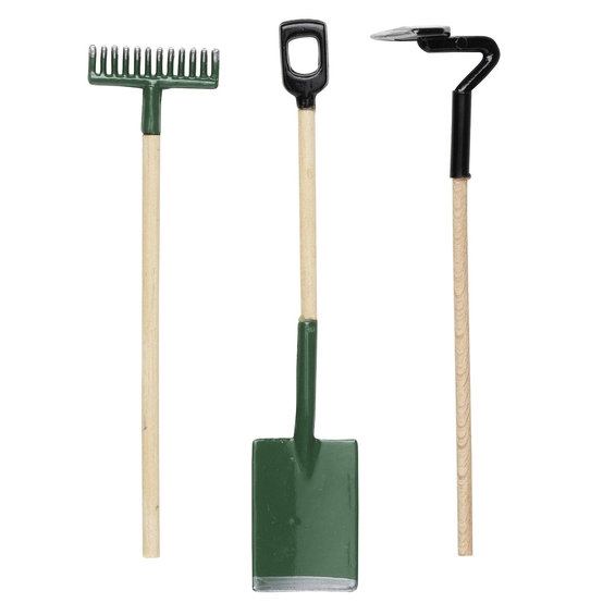 Puutarhatarvikkeet, pienet, metalliset. Täydellinen nukkekotiin tai miniatyyri asetelmaan. Puutarhatyökalut, 3 kpl. Korkeus 9-10 cm. Lapio, harava ja kuokka.