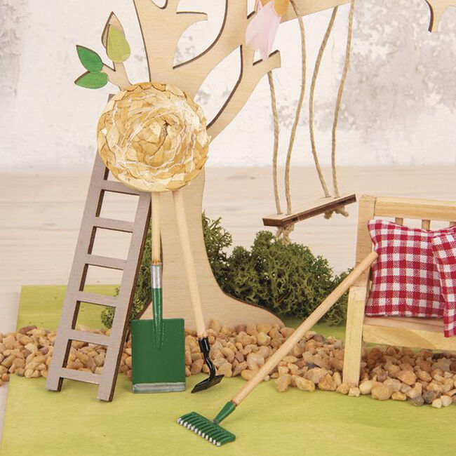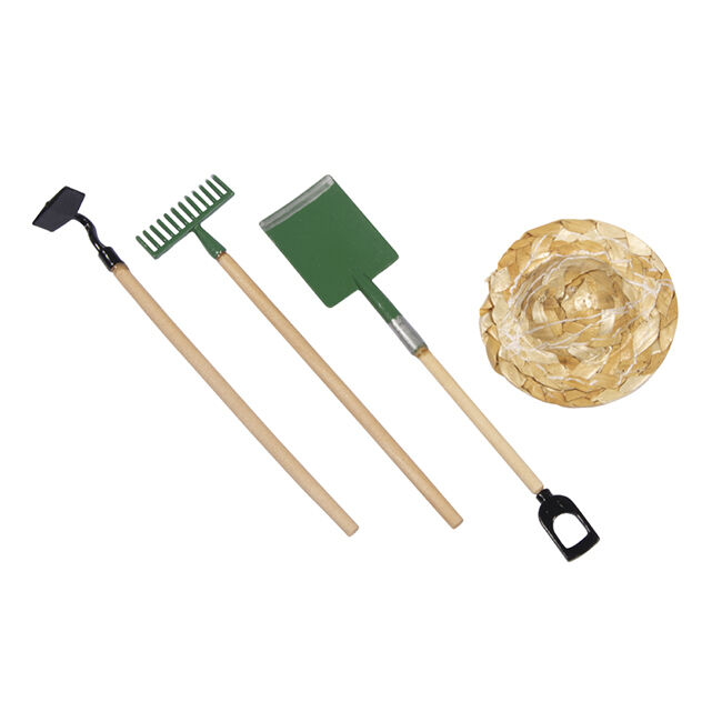 Miniatyyri puutarhatyökalut ja olkihattu. Hattu noin 4cm, työkalut noin 9,5 cm.