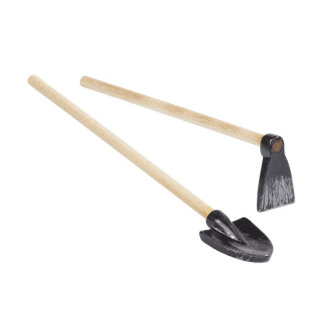 Miniatyyri puutarhatyökalut. Koko noin 10 x 2,5 cm. 2 osaa.
