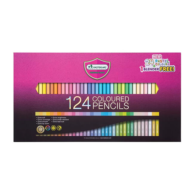 Paketti sisältää 124 värikynää, joista 24 pastellisävyistä. Korkealaatuiset puuvärikynät, joissa on täyteläinen ja pehmeä pigmentti sekä hyvä valonkesto. Kirkkaat värit, jotka näkyvät myös tummalla kartongilla.