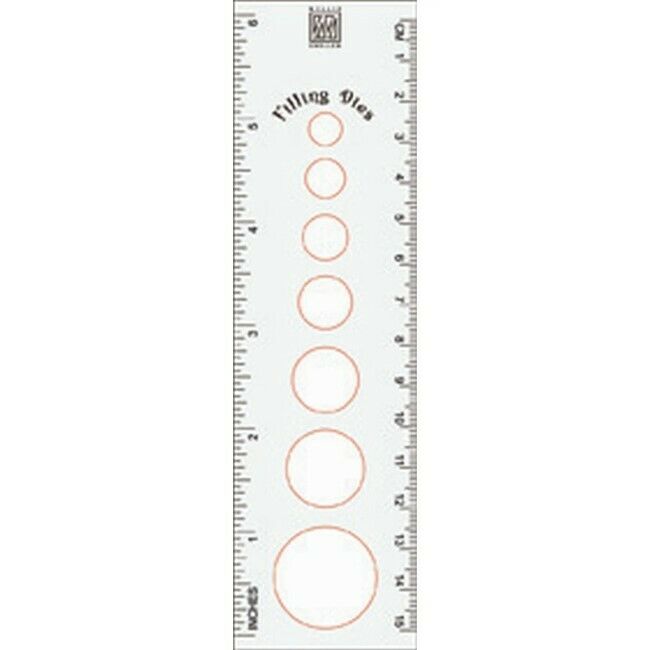 Tämä muovinen viivain on hyödyllinen työkalu quilling-tekniikassa. Viivoittimeen leikattujen ympyröiden avulla on helppo tehdä tasaisia 0,7 - 2,5 cm pyörteitä ja leikata nauhat täydellisen pituisiksi.
