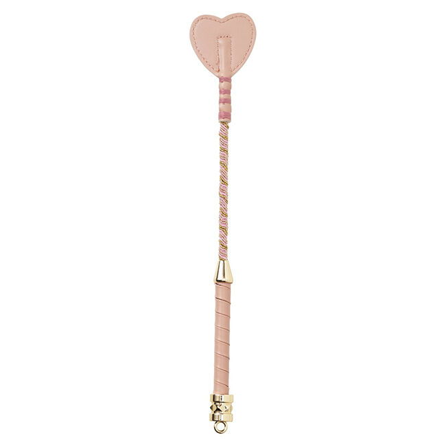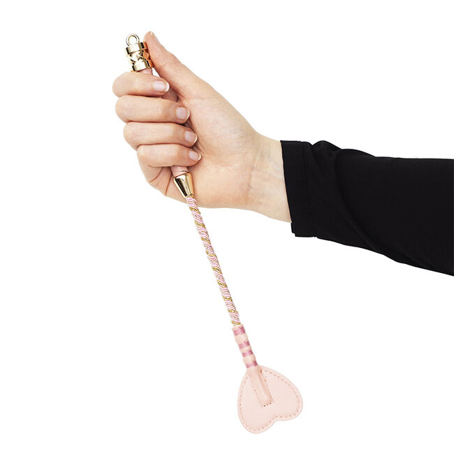 Keppihevosen ratsastusraippa, mutta todella ihana sellainen! Raippa on hyvin vaaleanpunainen ja kultainen - keppihevosellasi pitäisi tietenkin olla kimalteleva keppi. Kiinnikkeet on valmistettu kullanvärisestä metallista ja kahva on päällystetty vaaleanpunaisella tekonahalla. Itse keppi on päällystetty vaaleanpunaisella ja kultaisella glitterillä ja sen päässä on suuri ja pehmeän vaaleanpunainen tekonahkainen sydän. Pituus 32 cm.