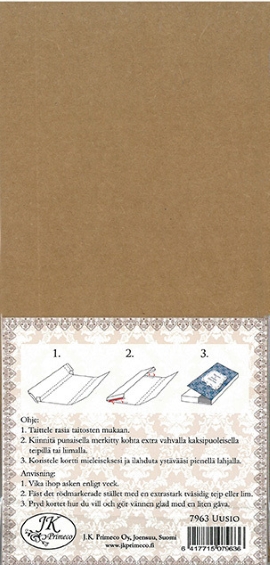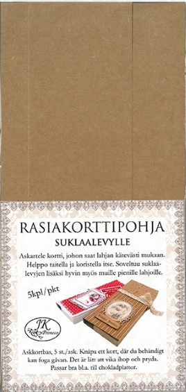 Iso rasiakorttipohja, jossa valmiit taitokset sekä ohjeet kokoamiseen. Sopii kooltaan useimmille suklaalevyille.