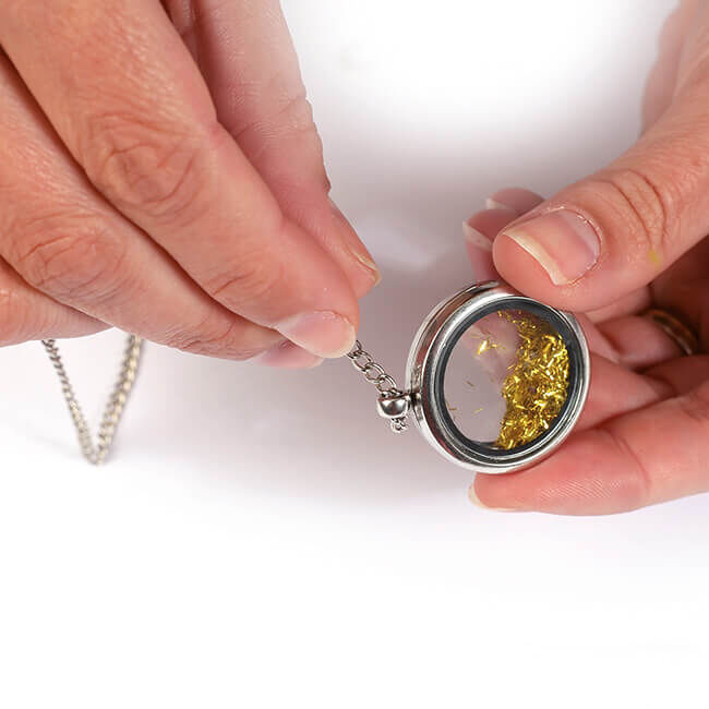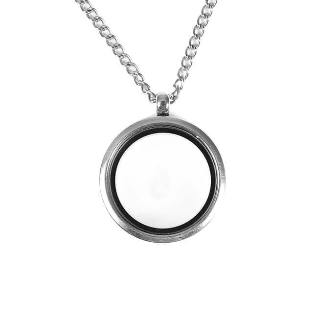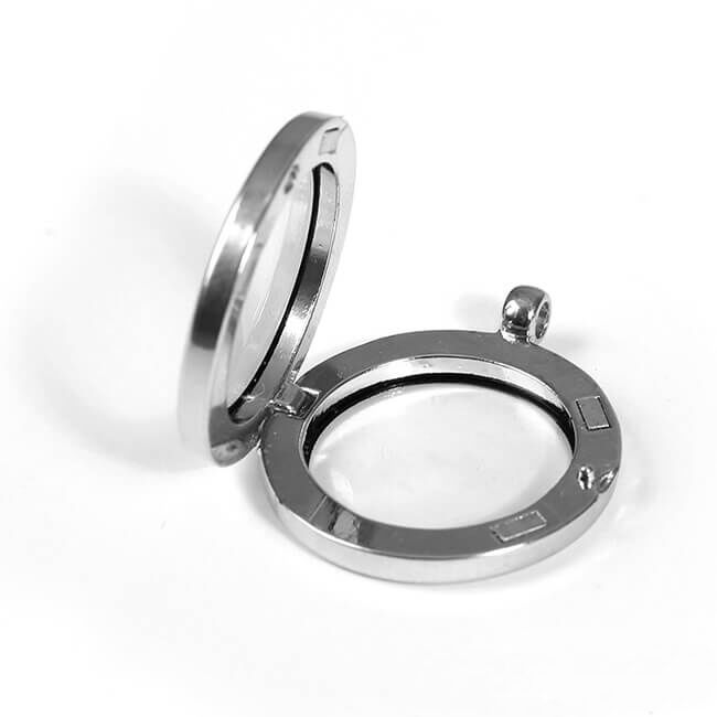 Hopeisesta metallista valmistettu pyöreä riipus on varustettu magneettilukolla, ja siihen voi laittaa suosikkimuistoja, valokuvia tai koriste-esineitä. Se on helppo kiinnittää nauhoihin tai ketjuihin.