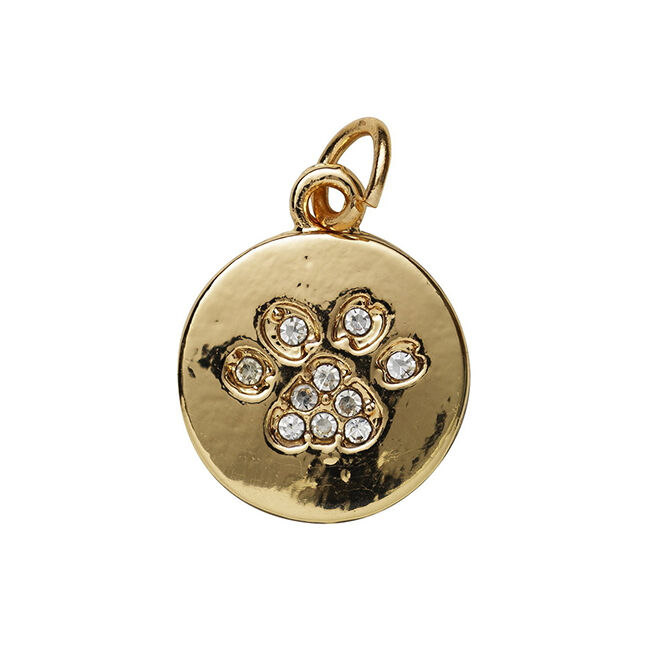 Kullanvärinen riipus jossa tassu strasseista, korumetallia, 13 x 16 mm.