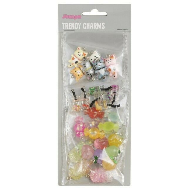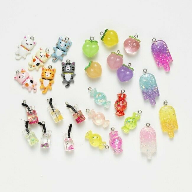 Pakkaus sisältää 28 hartsista valmistettua riipusta ja ne on varustettu metallirenkaalla. Riipukset ovat söpöjen kissojen, kimaltelevien karkkien, hedelmäjuomien, hedelmien ja kimaltelevien mehujäiden muotoisia!