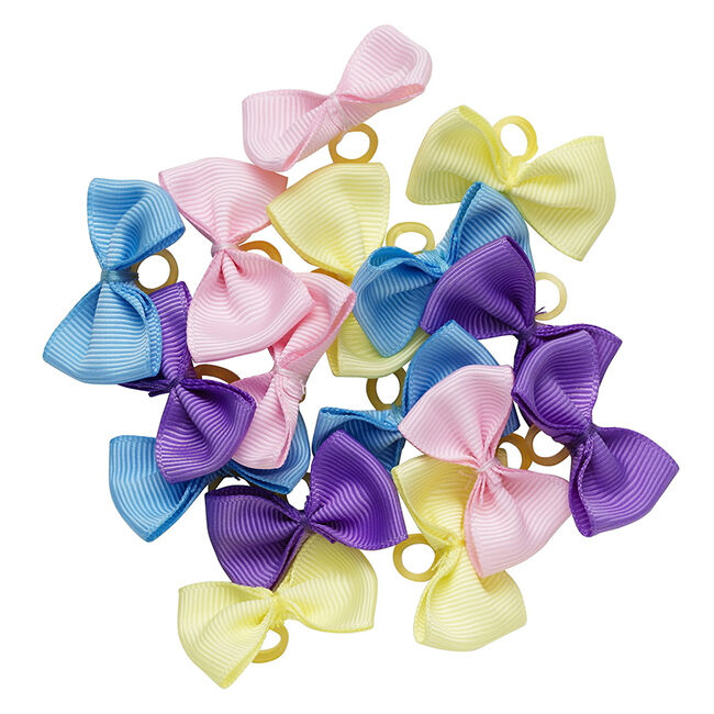 Pakkaus sisältää 16 pastellinväristä rusettia kumilenkeillä, 4 jokaista väriä. Valmistettu polyesteristä. Käsinpesu.