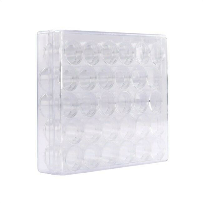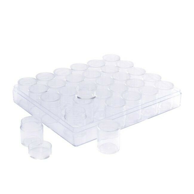 Säilytyslaatikko, jossa on 30 purkkia, on täydellinen säilytysratkaisu helmille, timanttimaalaustimanteille, paljeteille tai muille pienille koristeille, joita haluat kätevästi säilyttää. Purkkien koko on Ø2,5 cm ja korkeus 2,9 cm. Aukikierrettävä korkki.