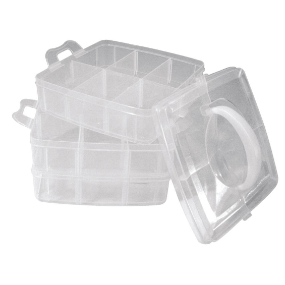 Tämä säilytyslaatikko sisältää 3 pinottavaa alustaa sivuläpillä ja kannen kahvalla. Se on valmistettu helposti puhdistettavasta, läpinäkyvästä muovista. Jokaisessa laatikossa on 6 lokeroa, joita voidaan myös suurentaa 14,7 x 14,7 cm:n irrotettavien välijakajien avulla. Täyttökorkeus 3 cm. Laatikot voidaan helposti ja turvallisesti kytkeä toisiinsa ja kanteen kielekkeiden avulla.