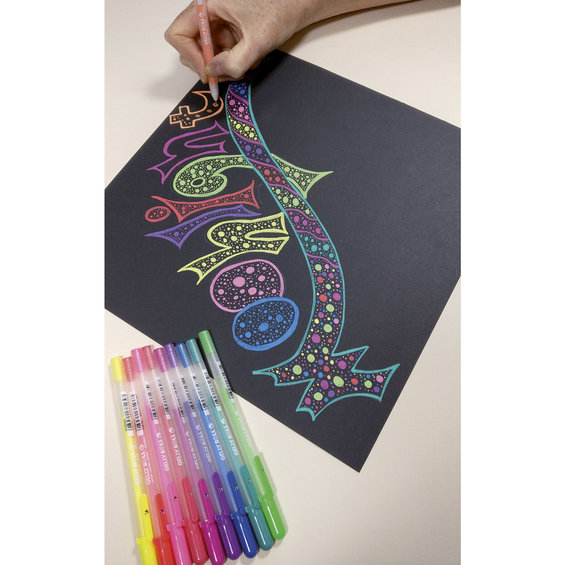 Parhaan tuloksen saavuttamiseksi käytä Gellyroll Moonlightia matta paperipinnoilla, sekä vaaleilla että tummilla.