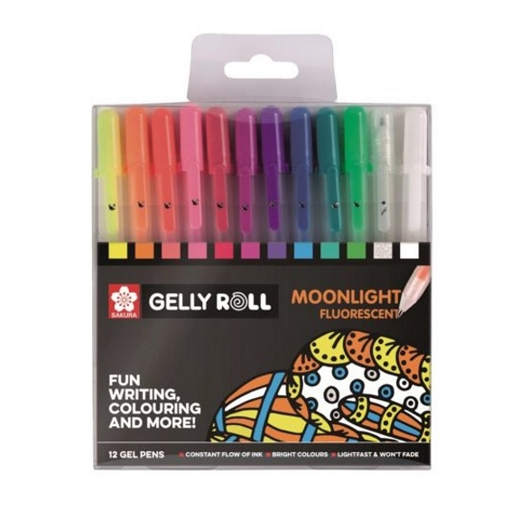 Gelly Roll Moonlight®: lla on Gelly Roll® -perheen kirkkaimmat ja täyteläisimmät värit. Kermainen, sileä, läpinäkymätön muste sopii erinomaisesti piirustukseen, doodlingiin ja väritykseen. Kaikki värit ovat kirkkaita valkoisella paperilla ja tuottavat erinomaisen jäljen mustalle paperille, ja fluoresenssi muste hehkuu mustan valonlähteen alla.
