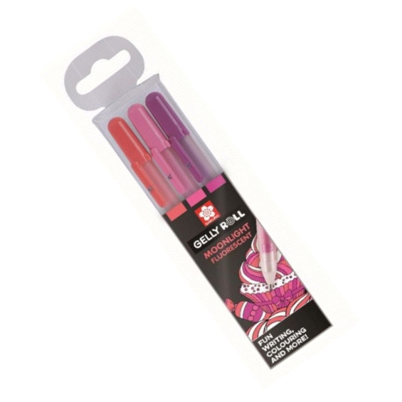Gelly Roll Moonlight®: lla on Gelly Roll® -perheen kirkkaimmat ja täyteläisimmät värit. Kermainen, sileä, läpinäkymätön muste sopii erinomaisesti piirustukseen, doodlingiin ja väritykseen. Kaikki värit ovat kirkkaita valkoisella paperilla ja tuottavat erinomaisen jäljen mustalle paperille, ja fluoresenssi muste hehkuu mustan valonlähteen alla.