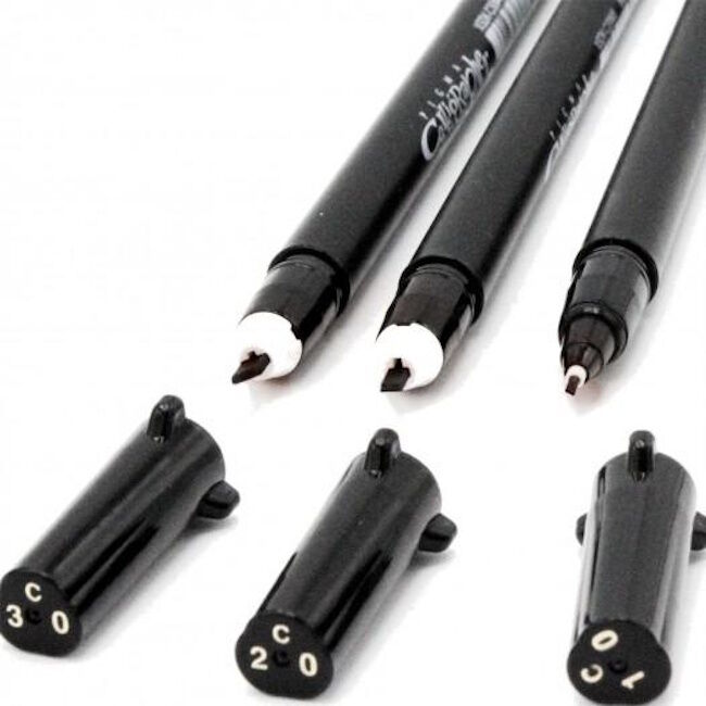 Pigma Calligrapher -setti sisältää 3 mustaa kalligrafiakynää, joiden kärkien koot ovat 0,1 mm, 0,2 mm ja 0,3 mm. Kova nailonkärki kestää kovaa painetta ja jatkuvaa käyttöä ja tarjoaa silti luotettavan, tasaisen musteen virtauksen reunasta reunaan. Pigma Calligrapher on kätevä, all-in-one, kestävä kirjoitustyökalu, joka tuottaa terävät reunat ja terävät hiusviivat.