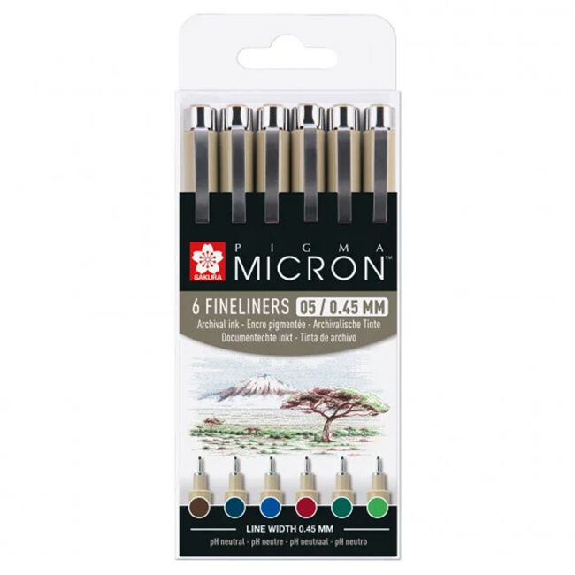Sakuran Pigma Micron -maavärit setti sisältää kuusi 0,45 mm:n kynää väreissä: seepia, sinimusta, kuninkaansininen, viininpunainen, metsästäjävihreä ja raikkaan vihreä.