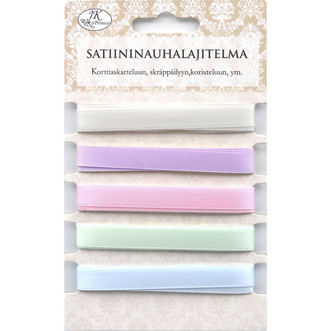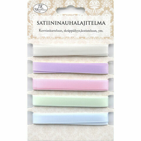 Satiininauhalajitelma paketointiin, askarteluun ja koristeluun. Pakkaus sisältää viisi eri väristä satiininauhaa. Jokaista nauhaa on 1 metri eli yhteensä viisi metriä.