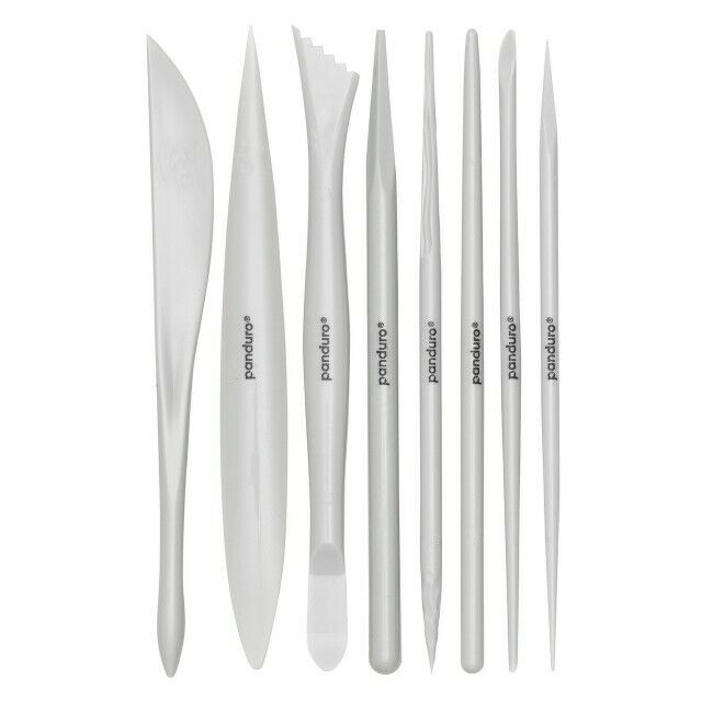 8 savityökalua, työkaluja savelle kaikissa muodoissaan, valmistettu harmaasta kevytmuovista. Tässä on työkalut, joita tarvitset ja joita et tiennyt tarvitsevasi! 6 työkaluista on suunniteltu työkaluilla molemmissa päissä, kun taas kahdella on "vain" pyöristetyt päät. Klassisen saviveitsen lisäksi tarjolla on erimuotoisia kärkiä, rypytyksiä, talttoja, kaivertimia ja muuta viivoja, pisteitä ja yksityiskohtia varten. Yhdessä työkalussa on myös kaksi erilaista pintakuviota – yksi fasetointiin ja toinen puumaisen tekstuurin luomiseen. Kaikki työkalut ovat 17 cm pitkiä.