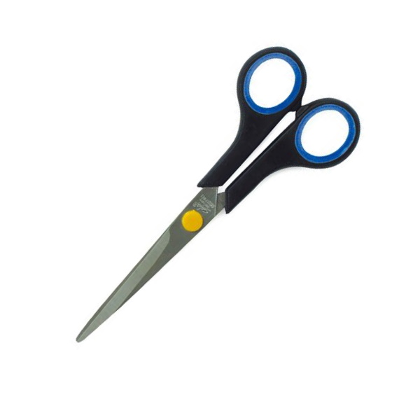 Paperisakset, terät ruostumatonta terästä. Ergonomiset, kumitetut kädensijat. Mustat kahvat, otepinta sininen, pehmustettu. Sopii sekä oikea- että vasenkätisille. Toimisto- ja yleiskäyttöön.