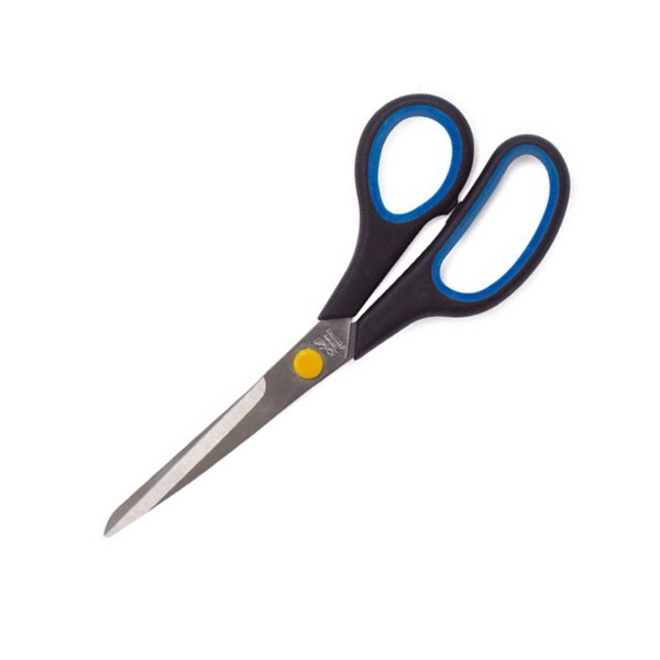 Monikäyttösakset, terät ruostumatonta terästä. Ergonomiset, kumitetut kädensijat. Mustat kahvat, otepinta sininen, pehmustettu. Sopii sekä oikea- että vasenkätisille. Toimisto- ja yleiskäyttöön.
