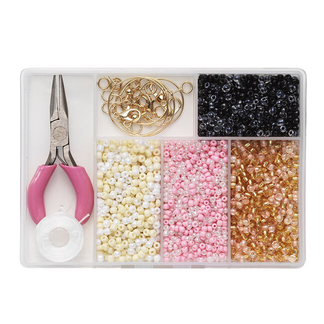 Korusetti, jossa on kaikki mitä tarvitset luodaksesi oman kauniin ja ainutlaatuisen korusi lasisiemenhelmistä. Siisti rasia sisältää paljon, usko pois!