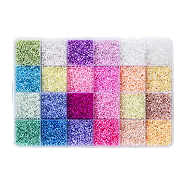 Ihana setti, jossa on 24 lokeroa täynnä kiiltäviä rocaille-lasihelmiä pastelliväreissä. Mikä alku lukuisille helmirannekoruille ja -kaulakoruille! Helmiä kutsutaan myös siemenhelmiksi. Helmet ovat hyvin pieniä ja niiden halkaisija vaihtelee 2–2,5 mm:n ja paksuuden välillä 1–1,5 mm. Reiän halkaisija on vain 0,8–1 mm, joten ohuen korulangan käyttö on todella suositeltavaa. Pieni koko ja rikas kiilto mahdollistavat upeiden kuvioiden ja värinvaihdosten tekemisen helmillä. Yhteensä pakkaus sisältää noin 480 grammaa helmiä, mikä on paljon! Rasian koko on 19 × 13 × 2 cm ja se on valmistettu läpinäkyvästä muovista.