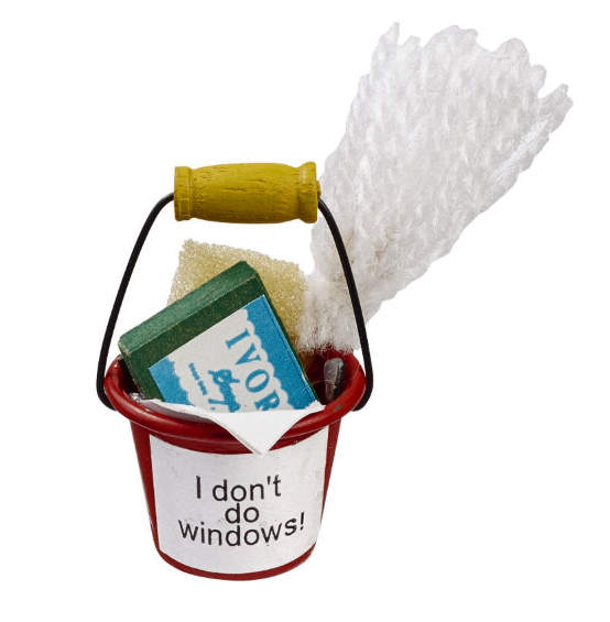Siivoussanko: ämpäri, pesusieni, pölyhuiska. Koko 3 cm.
