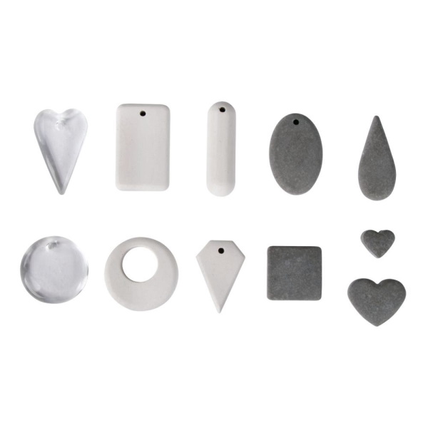 Silikonimuotti 11 kuviolla. Ihanteellinen valumiseen hartsilla, korubetonilla, mutta myös saippualla tai vahalla. Kuvioiden mitat n. 2-5 cm: esim. pieni sydän n. 2 cm, suorakulmio, soikea n. 5 cm.