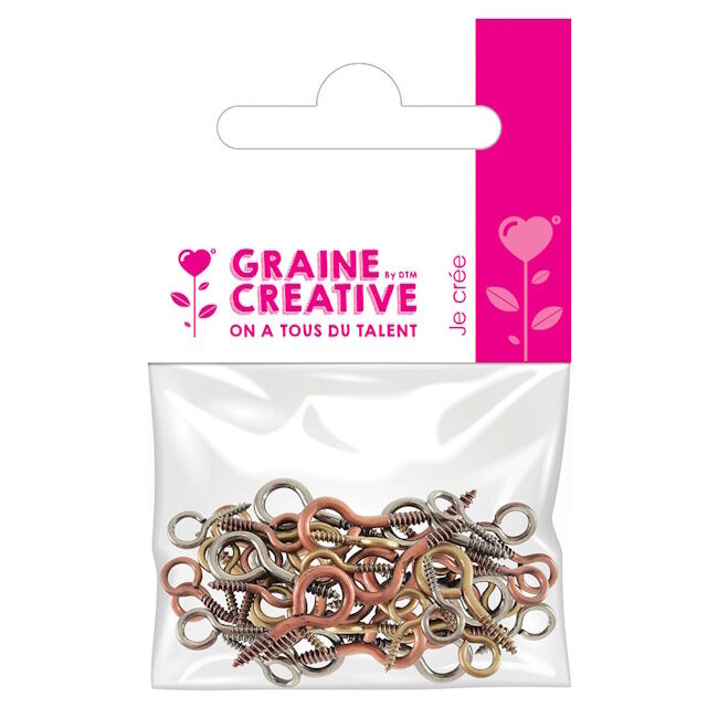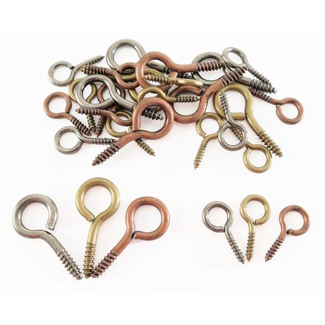 Silmukkaruuvilajitelma, kaksi kokoa 15mm ja 23 mm. Kolme eri väriä, hopea, kulta ja pronssi.