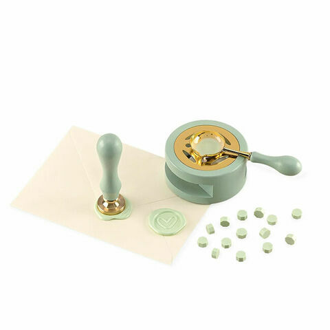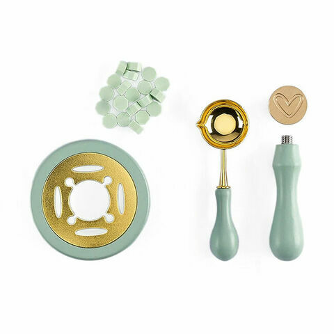 Luo upeita vahasinettejä tällä tyylikkäällä vahasinettien aloitussetillä. Setti sisältää kaiken tarvittavan aloittaaksesi heti: vahasinettien lämmittimen, sulatuslusikan ja vaihdettavan leimasimen pään (sydän kuvio). Mukana tulevat mintunväriset vahahelmet (n. 7g) antavat tyylikkään viimeistelyn kirjekuorillesi, kutsukorteillesi tai scrapbooking-projekteillesi.