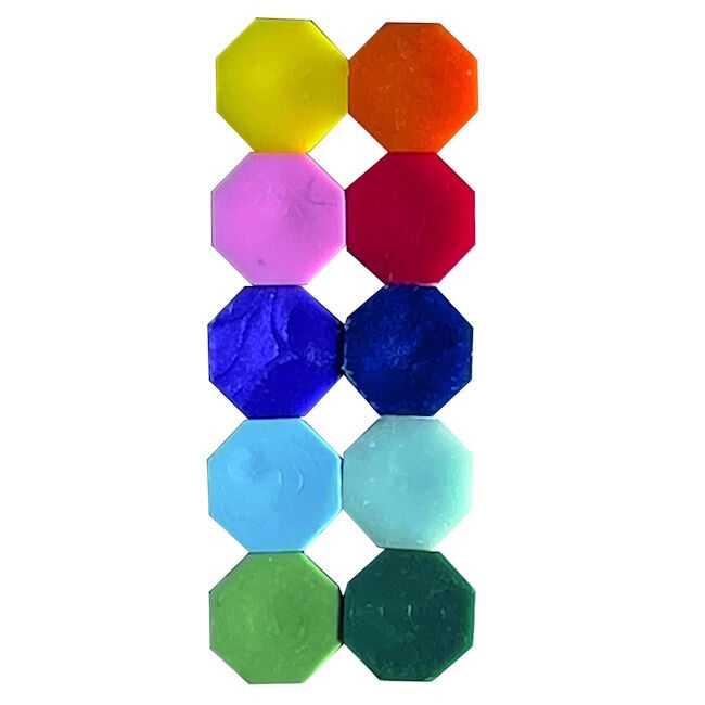 Lokerikko, joka sisältää 10 väriä sinettivahahelmiä. Yhdessä lokerossa on noin 20kpl helmeä.