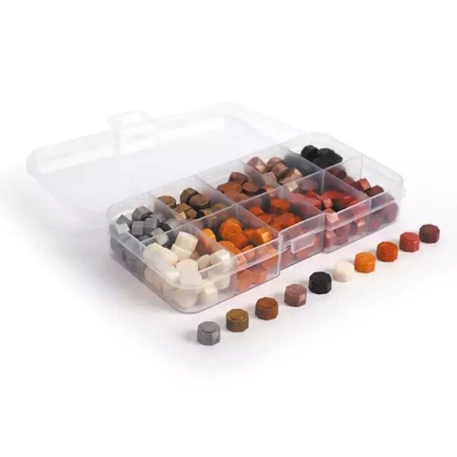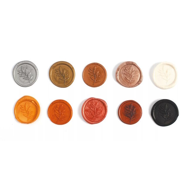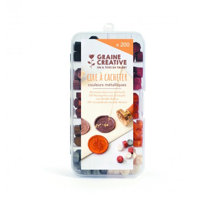 Sinettivahahelmet 10 metallivärissä sinettien valmistukseen. Sinetin tekemiseen riittää 3 helmeä. Aseta 3 helmeä lusikkaan ja lämmitä vaha asettamalla lusikka polttimelle. Kun vaha on muuttunut nestemäiseksi, kaada se pinnalle ja paina siihen sinettileimasin. Anna jäähtyä ja sinetti on valmis! Käytä 3 samanväristä helmeä tai tee marmoroitu sinetti sekoittamalla 3 väriä yhteen. Sekoita tätä varten sulatettua vahaa hetken cocktailtikulla. Kokeile eri värejä!