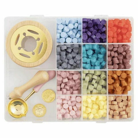 Sisältää 12 värillistä vahaa (20 grammaa), vahansulattajan, vahalusikan, 2 sinettiä (ruusu ja puu) ja leimasinvarren.