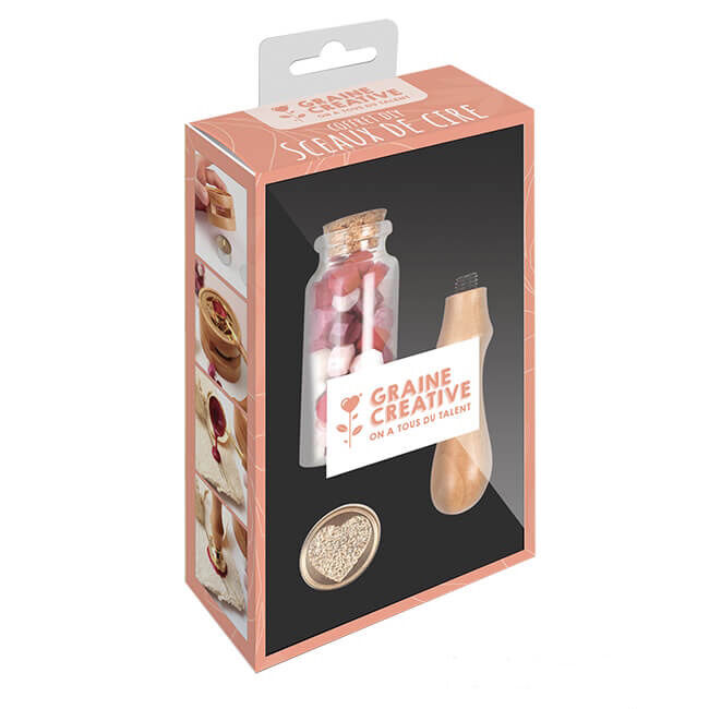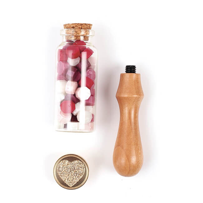 Se sisältää sinettikahvan, sydänaiheisen vahasinetin (halkaisija 25mm) ja 50 sinettipastillia viidessä eri värissä.