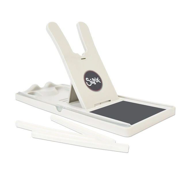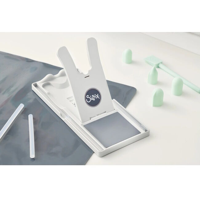 Sizzix-liimapistooliteline pitää Sizzix-liimapistoolin, kun se ei ole käytössä, jotta se ei tippu pöydälle tai projektille. Liimapistooliteline sisältää irrotettavan, helposti puhdistettavan levyn liiman keräämistä varten. Jalusta taittuu helposti kokoon ja siihen mahtuu kaksi 8" pitkää tai neljä 4" pitkää liimapuikkoa.
