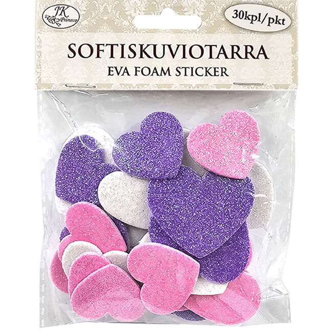 Pehmeät softiskuviotarrat askarteluun ja koristeluun. Pakkaus sisältää 30 kappaletta erilaisia softiskuvioita, joissa on glitteriä. Kuvioiden takana on tarrapinta.