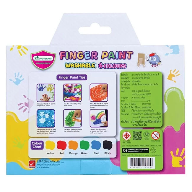MasterArt sormivärit kätevissä uudelleen avattavissa muovituubeissa. Sormivärit ovat myrkyttömät ja erittäin helppokäyttöiset. Värit on helppo pestä pois iholta ja useimmista kankaista vedellä ja saippualla. Pese maalit ennen kuin ne ehtivät kuivumaan.