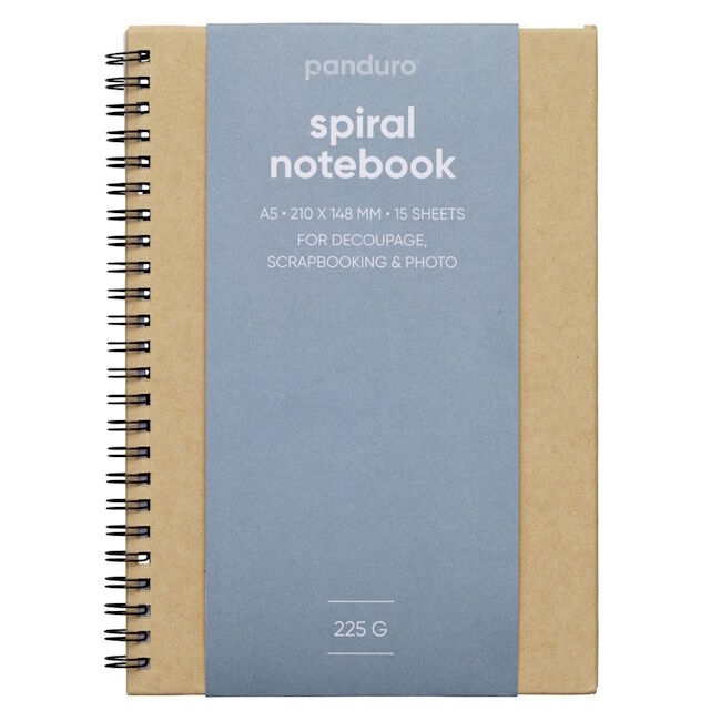 A5-kokoinen spiraalivihko (148x210 mm). Tämä kierresidottu vihko on hieman enemmän kuin vihko. Kansi on valmistettu kovasta luonnonvärisestä kartongista ja sisällä on 15 käsittelemätöntä valkoista arkkia, joiden pintapaino on 225 gsm. Runsaan neliöpainon ansiosta arkit sopivat hyvin decoupage-, scrapbooking-, valokuvaus- ja muihin vahvempaa paperia vaativiin toimintoihin.