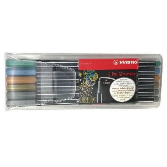 Pakkauksessa on viisi hohtavaa metalliväriä: kulta, hopea x 2, kupari, metallinen sininen ja metallinen vihreä. Hyvä näkyvyys metallivärien erinomaisen peiton ansiosta, erityisesti tummalla paperilla tai kortilla. Kirjoita heti - ei tarvita ravistelua tai pumppausta. Korostaa loistavasti ja kirkkaasti. Tarkkaa väriä vankan M-kärjen (Medium) avulla. Yksityiskohtainen piirustus, jossa viiva on 1,4 mm. Tunnettu STABILO Pen 68 -vesipohjainen muste.