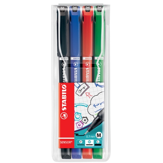 Fineliner perusväreissä; musta, sininen, punainen ja vihreä.