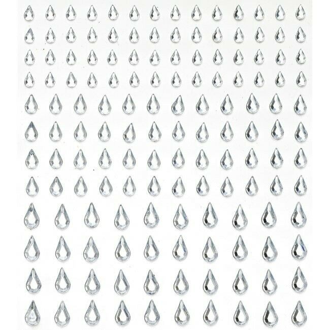 Pisaran muotoisia tekojalokivitarroja kolmessa eri pituudessa – 5, 7, 10mm, yhteensä 288 läpinäkyvää/lasimaista itseliimautuvaa tarraa. Pakkaus sisältää 2 arkkia 12×13,5 cm ja helmet on valmistettu akryylistä.