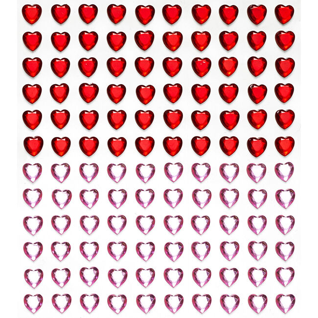 Sydämen muotoiset strassitarrat – läpinäkyviä, lasin kaltaisia ja punaisia. Jokainen sydän on Ø8 mm ja pakkauksessa on yhteensä 240. Pakkaus sisältää kaksi 12 × 13,5 cm arkkia ja helmet on valmistettu akryylista.