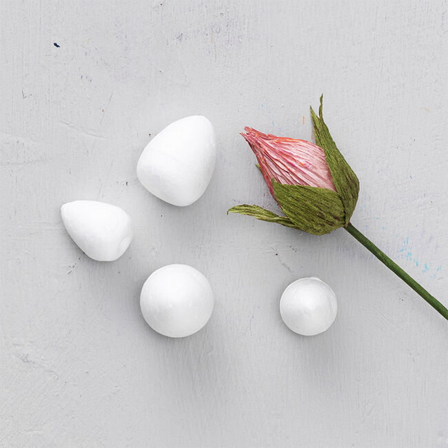 20 pisaranmuotoista kukkanuppua styroksista. Täydellinen niille, jotka rakastavat tehdä paperikukkia kreppipaperista ja muista materiaaleista! Nuput on valmistettu tukevasta styroksista, joten niihin on helppo kiinnittää koristeita ja ripustustarvikkeita.