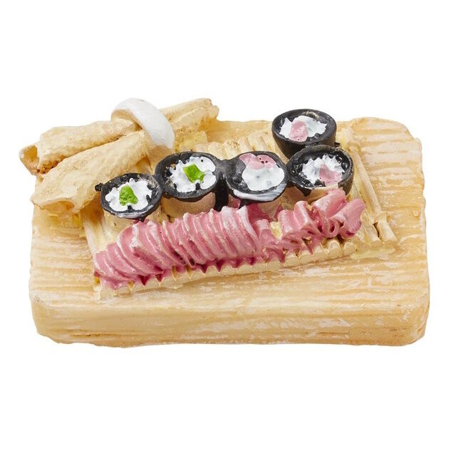 Miniatyyri sushitarjotin, koko noin 4 x 3 cm.