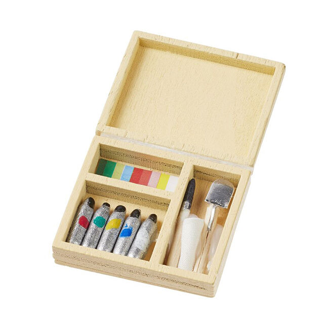 Miniatyyri taiteilijan värisetti. Koko noin 3,5 x 3 cm.