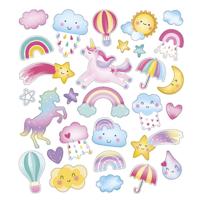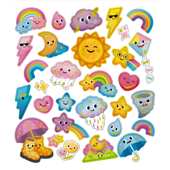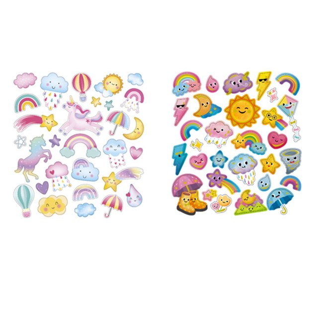 Isoja hienoja tarroja tehosteilla! Jokainen pakkaus sisältää 4 arkkia - 2 kutakin mallia. Arkit ovat kooltaan 17 × 15 cm.