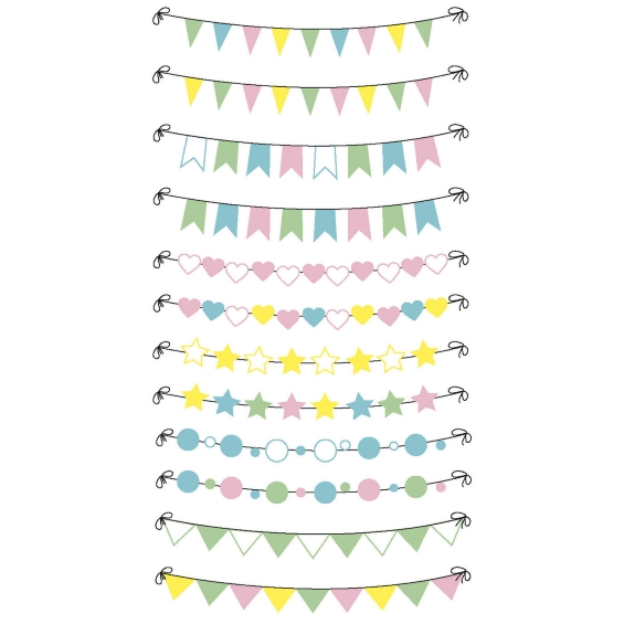 Tarrat, valmistettu muovista (läpinäkyvä tausta). Koristelu, scrapbooking, art journaling, cardmaking jne. 2 arkkia 7x13 cm. Viirit, 12 kpl.