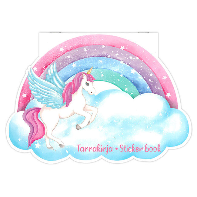 Tarrakirja tarrojen säilyttämiseen ja keräilemiseen. Liimaa, irrota ja loihdi oma satumaailmasi – tarrakirja täynnä taikaa ja iloa! Hauska yksisarvisen ja sateenkaaren muotoinen tarrakirja yhdistää luovuuden ja leikin! Sopii erinomaisesti matkoille, kotiin ja lahjaksi pienille yksisarvisfaneille! Tarrakirja sisältää 10 arkkia eli 20 sivua. Tarrakirjan sivuissa on pinnoite, jolloin tarrat ovat helposti uudelleen käytettävissä.